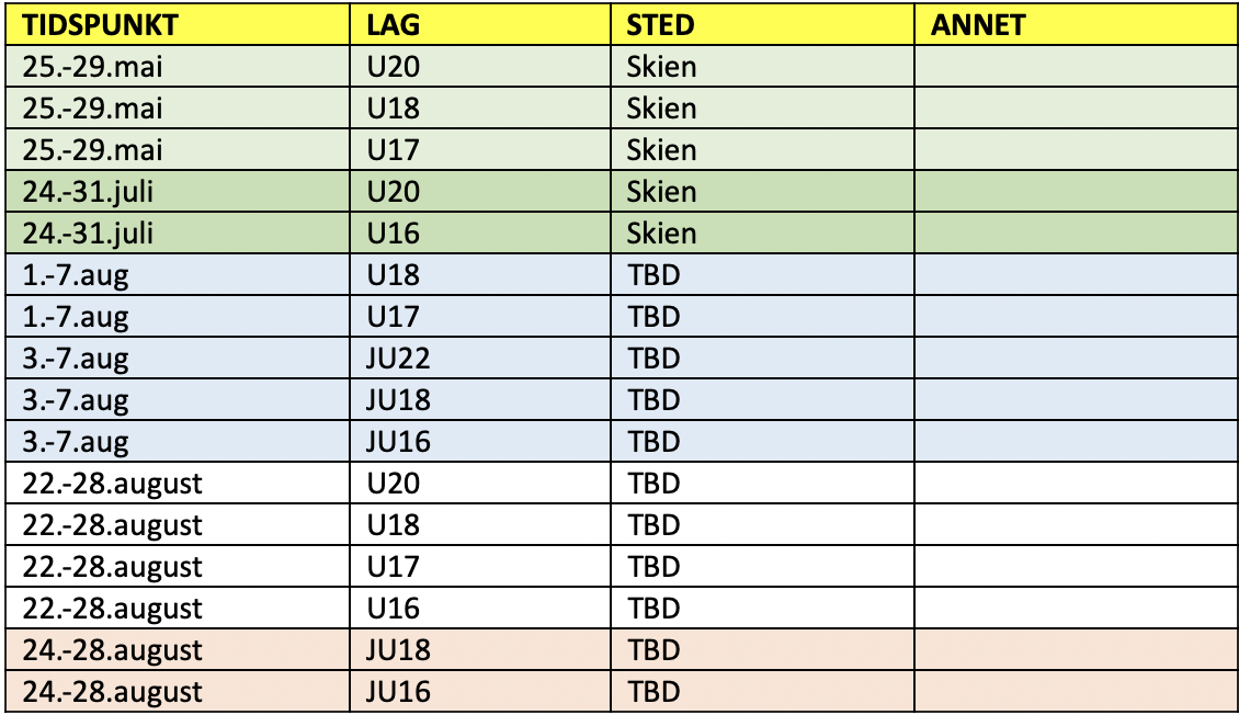 Under ser dere grovplanen for landslagsaktiviteten som er planlagt sommeren 2022, samt inngangen til neste sesong.